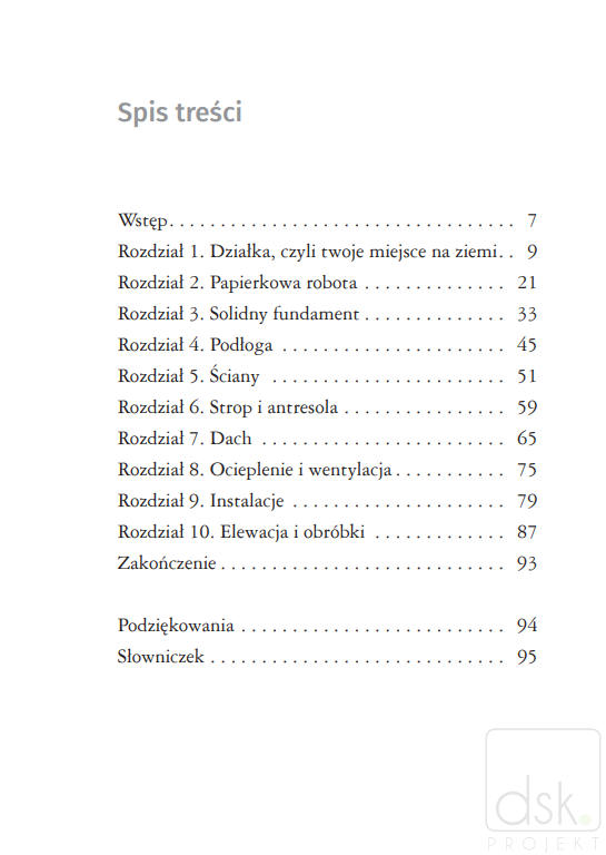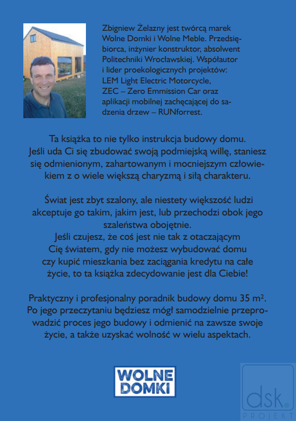 Po jego przeczytaniu będziesz mógł samodzielnie przeprowadzić proces jego budowy i odmienić na zawsze swoje życie. Książka jest wypełniona wartościowymi informacjami i opisuje pełen proces budowy domku do 35m2, od wiercenia otworów pod fundamenty, przez podłogę i jej ocieplenie, ściany, otwory okienne, konstrukcję dachu i jego pokrycie jak i wentylację i ogrzewanie.