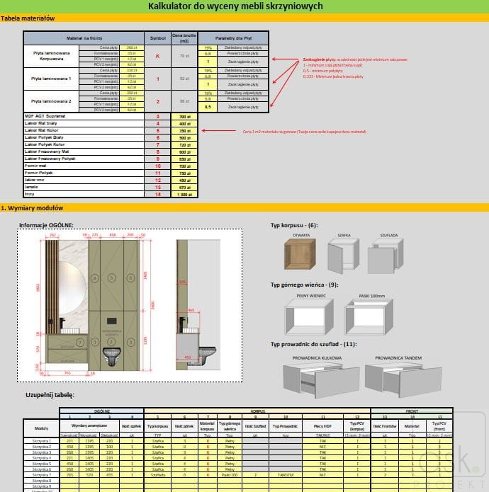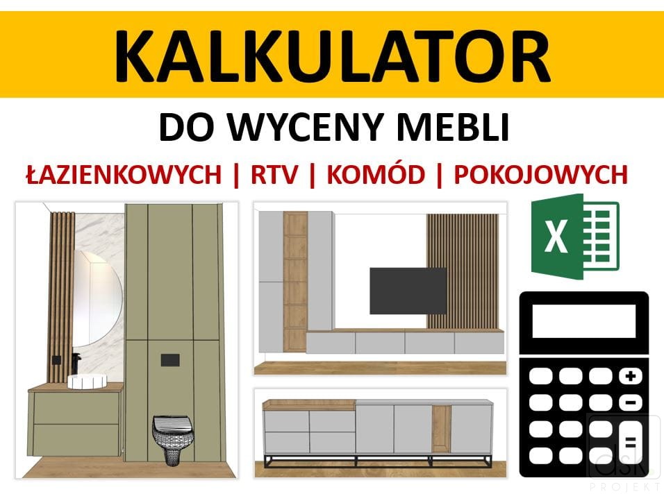 Kalkulator przeznaczony dla osób i firm zajmujących się sprzedażą, produkcją i montażem mebli na wymiar. Jest to narzędzie do szybkiego przygotowywania wycen mebli np. łazienkowych, komód, zabudów RTV, itp. (Excel)