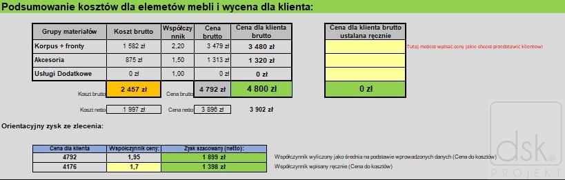 W wyniku uzupełniania powyższych informacji wiemy jakie są koszty realizacji zlecenia z rozbiciem na poszczególne grupy materiałów i usług co w połączeniu z dobrze ustawionym współczynnikiem ceny daje nam finalną cenę dla klienta oraz szacowany zysk ze zlecenia.