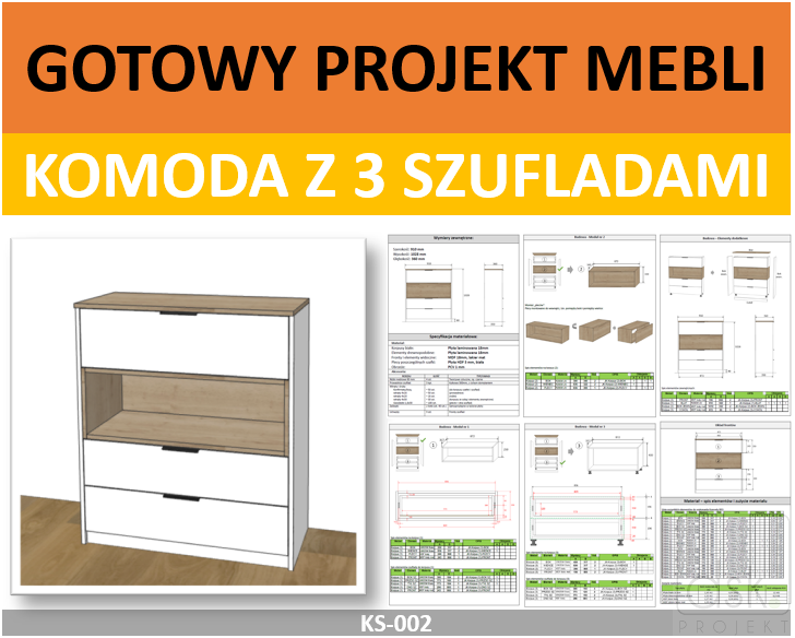 Projekt takiej komody zawiera wszystkie informacje o materiałach i akcesoriach jakie będą Ci potrzebne do jej wykonania.