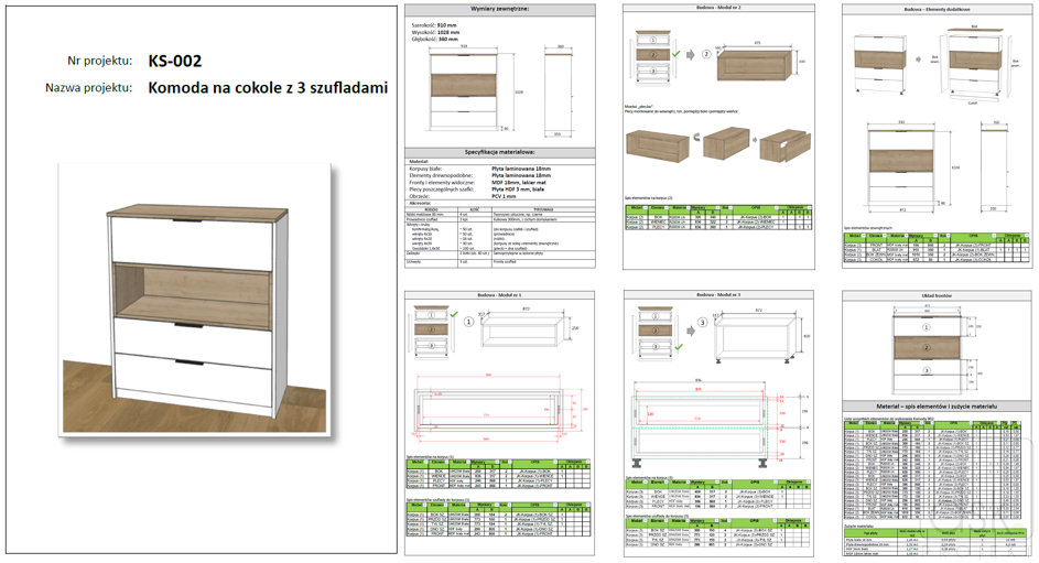 Nasze projekty zawierają informacje o materiałach i akcesoriach, spis poszczególnych elementów (tzw. formatek) wraz z ich opisem aby było łatwiej je kompletować i składać.