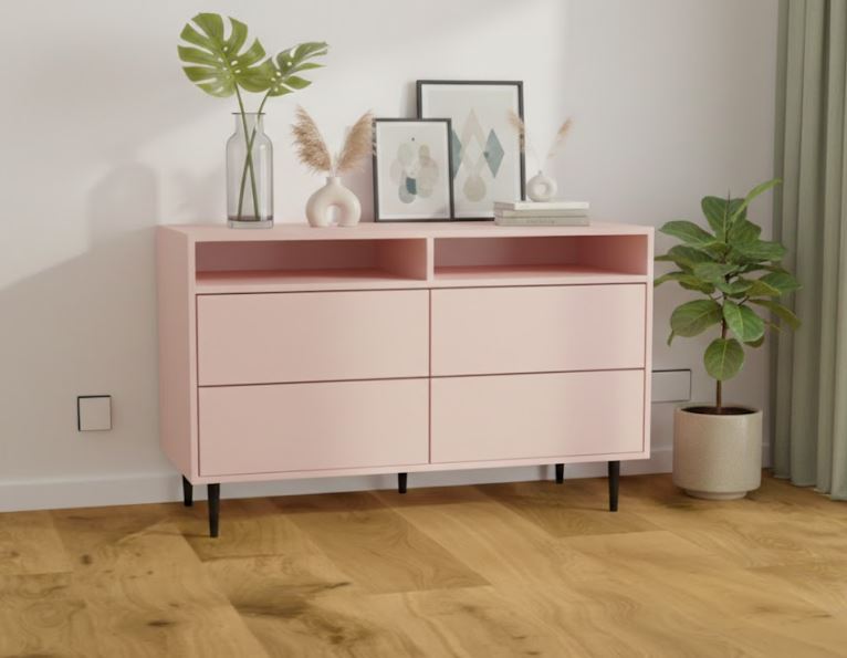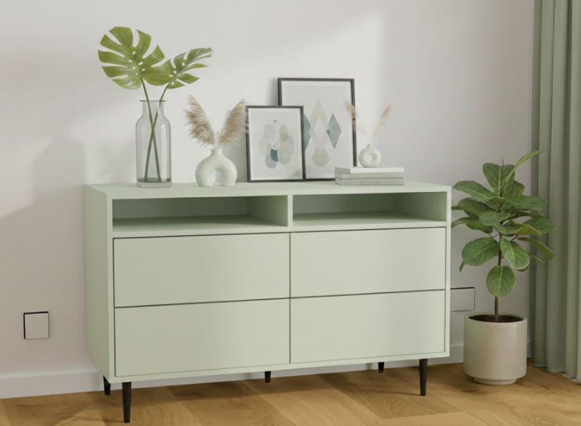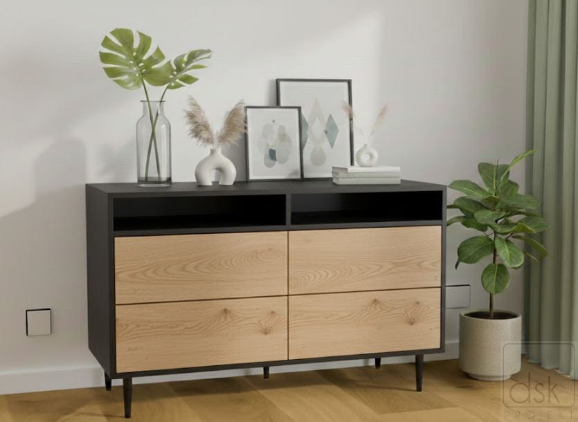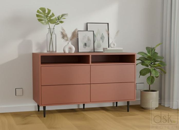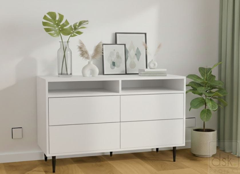 Przedstawiony mebel to komoda z 4 szufladami oraz otwartą półką stojąca na nowoczesnych nóżkach. Wyposażona jest w 4 szuflady otwierane na dotyk (mogą również być na uchwyt) i otwartą półkę np. na sprzęt RTV. Będzie to bardzo użyteczny i pojemny mebel do przechowywania a jednocześnie doskonała ozdoba w Twoim wnętrzu.