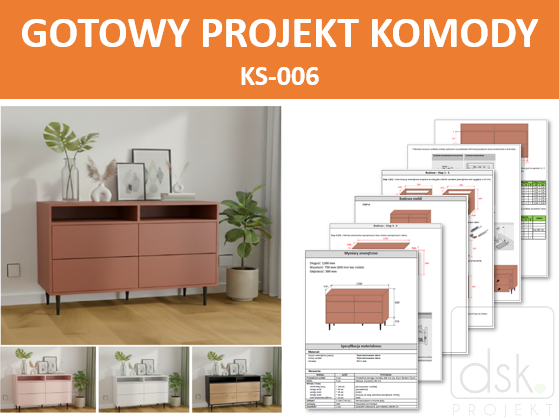 Projekt takiej komody zawiera wszystkie informacje o materiałach i akcesoriach jakie będą Ci potrzebne do jej wykonania.