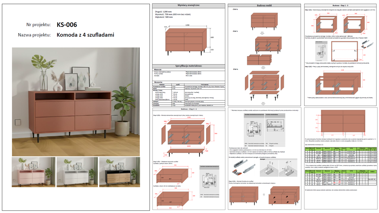 Nasze projekty zawierają informacje o materiałach i akcesoriach, spis poszczególnych elementów (tzw. formatek) wraz z ich opisem aby było łatwiej je kompletować i składać.